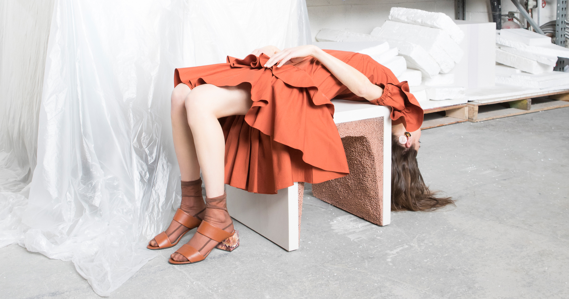 Gray Matters Marmo Sandal in Caramello Marrone; wearing Tome cold shoulder dress in Rust, ARC objects earrings, Darner mesh socks.
