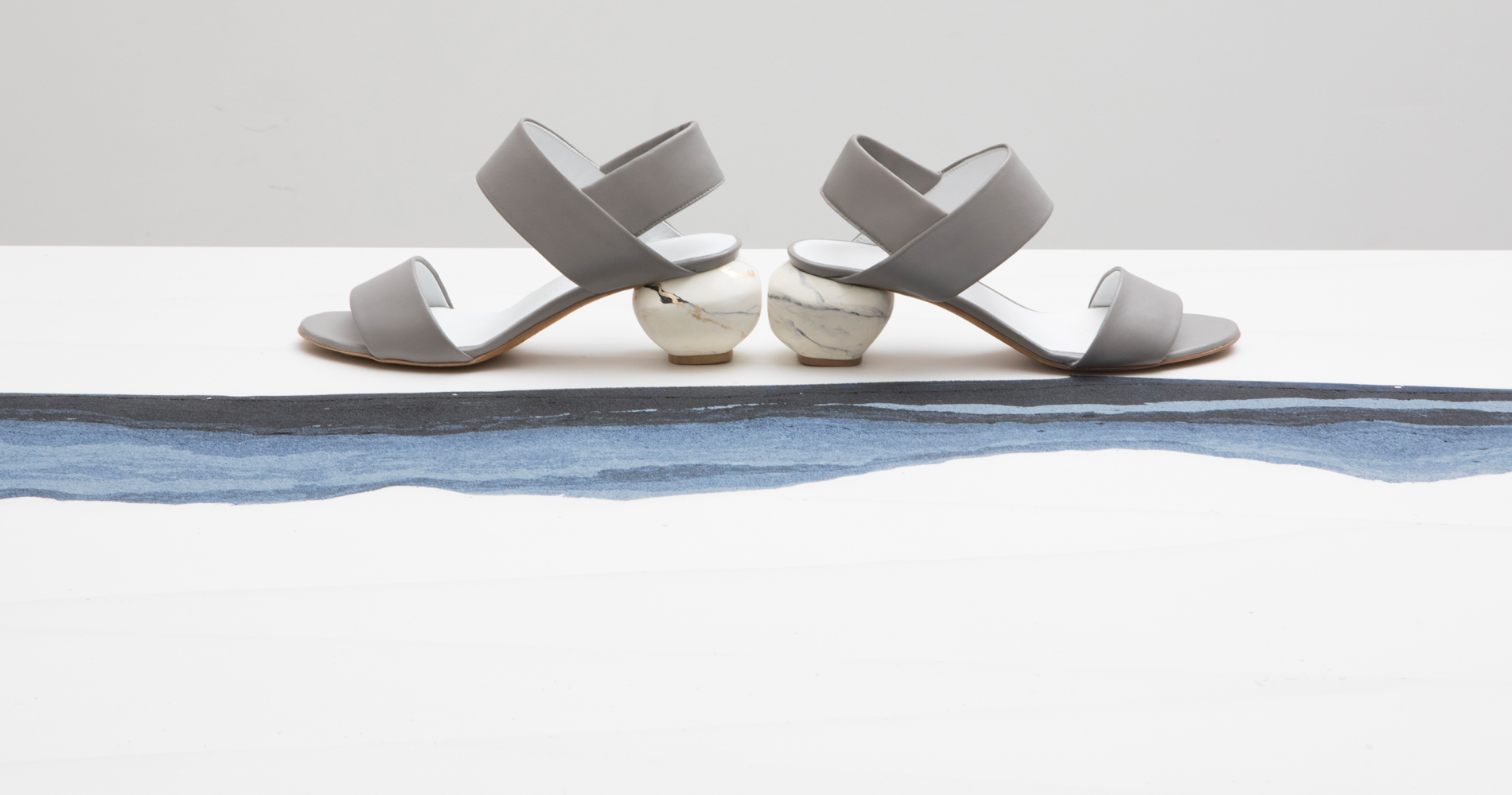 A throwback slide show, endless scroll, David Bowie, David Copperfield, the wicked witch, harvest moon, a flip book shuffle stops and tumbles you into a vacuum. A postmodern assimilation of references, a conversation between mediums and the ability to traverse it all is what first led me to Fernando. We met by chance and I’ve been wanting to interact with his work, which crosses sculpture and design with the painterly, ever since. I am for aesthetics with narrative, once the story is in place the need to isolate falls away, Fernando’s work stands for this. I pair elements with shared traits based on feeling. Form follows sculpture and a distinct use of materials from nature led me to create a collective personality with Gray Matters compositional shoe collection and Fernando’s body of work cast from salt, sugar, sand, coffee, corn. Gray Matters signature midi heel, a metaphor for the in-between space I surrender myself to share and evolve.