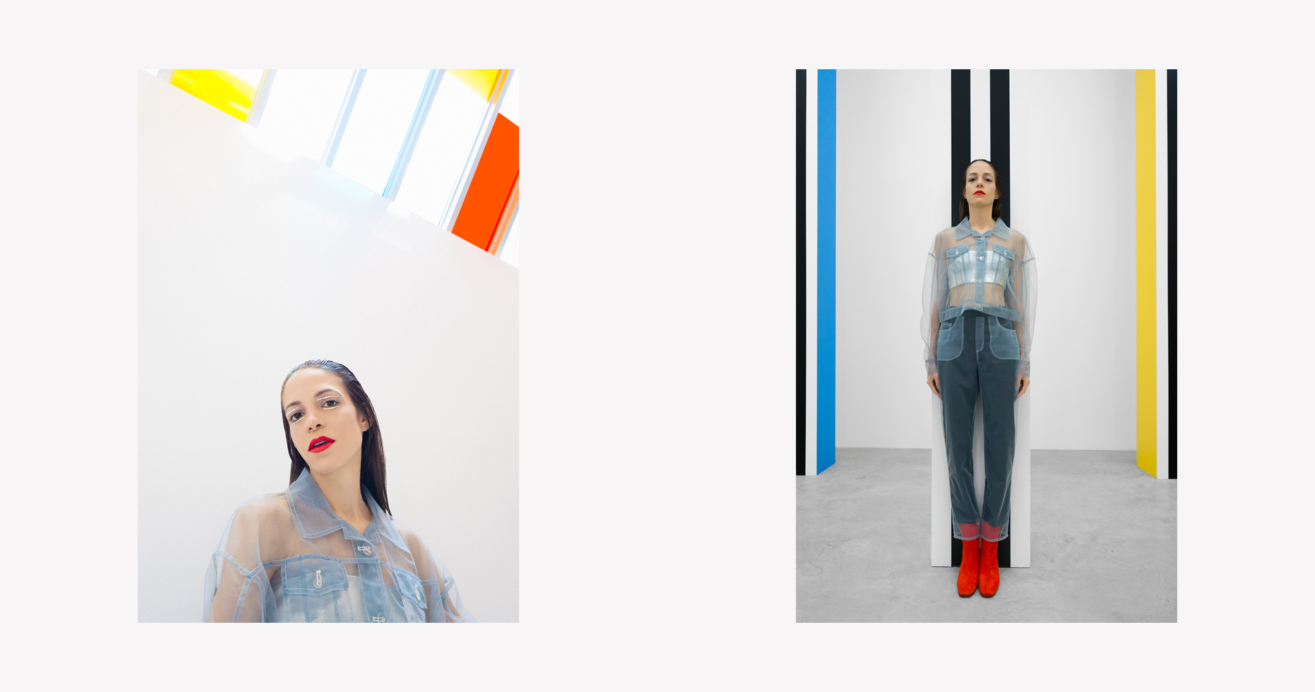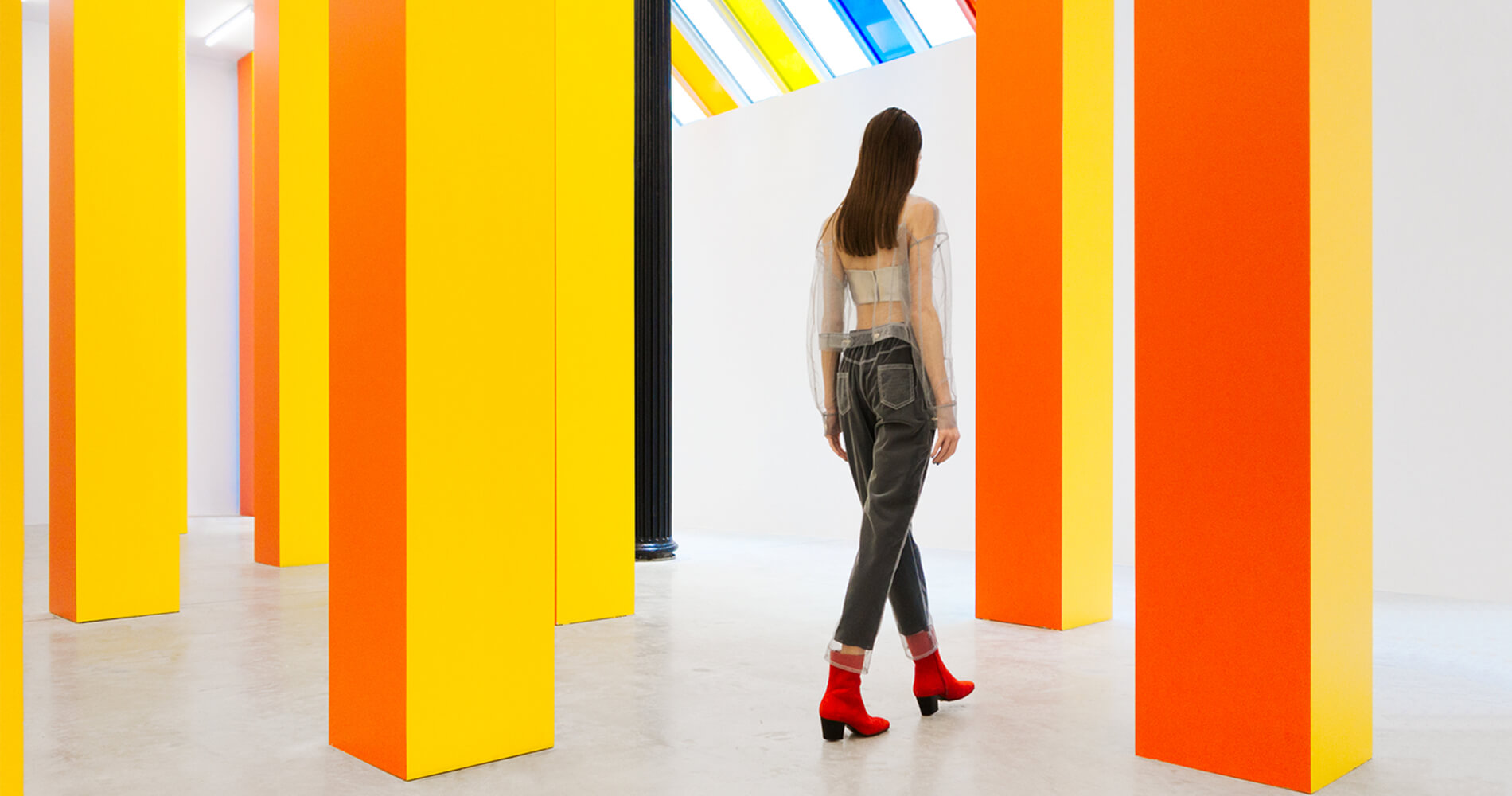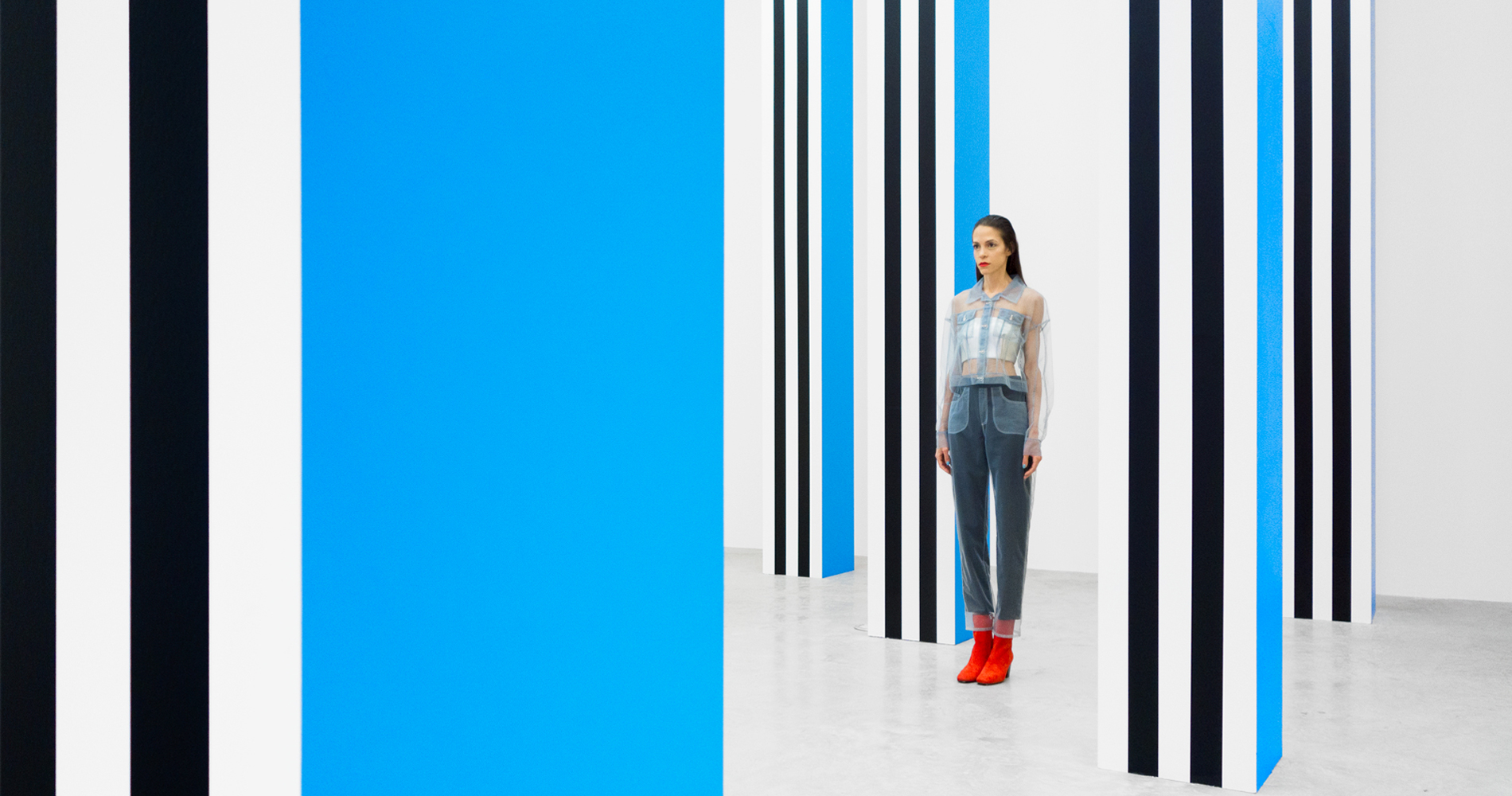 Floating on the brink, I extend into Daniel Buren’s lenticular land of cascading columns where the artist has used his signature alternating 8.7 cm. wide stripe to christen Bortolami’s new, architecturally rich location. To overlay a look from Noa Raviv’s Non-Place collection into Buren’s in situ works is to illuminate our contemporary minds with the value of ephemeral experiences. Light, materiality and construction tinged with formality crystalize in works bound only by their own narrative. Chromatic contrasts emphasize beaming forms and heighten the vestige of a memory that tastes like a summer cherry.