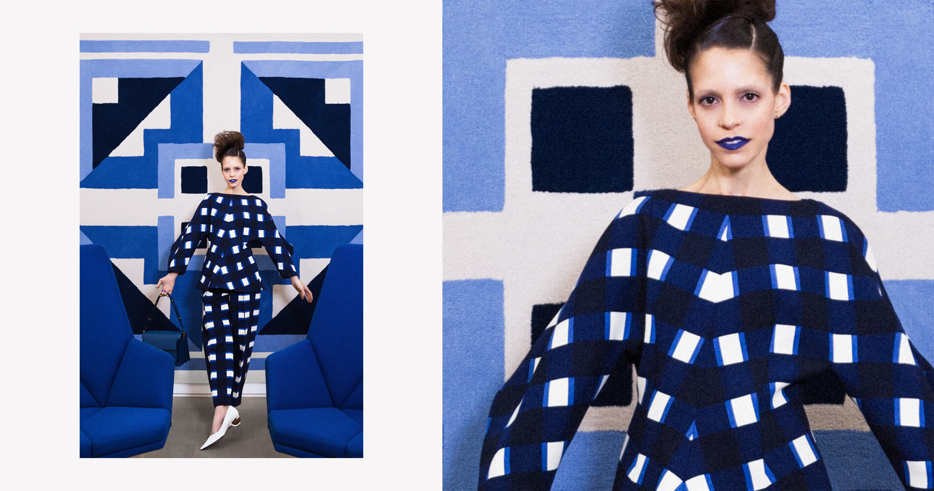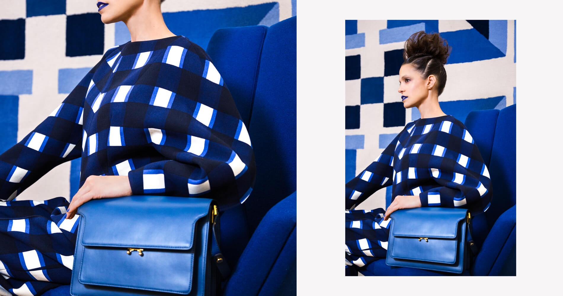 Pierre Paulin, Galerie Perrotin; Marni checkered oversized sleeve top, Marni high-waisted checkered trousers, Marni spherical heeled pump, Marni cobalt trunk bag, MAC lipstick in Matte Royal