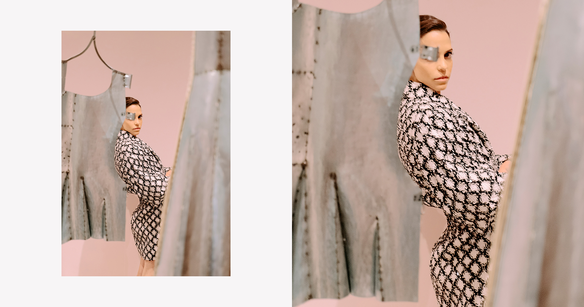 The intertwine of art, life and origin is present, non-conformist artistic gestures hold a collective power and prowess for enlightenment. If there ever was any modern armour designed to maximize personal power and integrate the shadow’s sacred creative it is Gabrielle Chanel’s revolutionary signature, the Chanel Jacket. Culture is about freedom and in the 1950s Chanel saw womenswear as too constrained thus she liberated the women of her time by dressing them in suits that made them feel at ease. This freedom to move was achieved through her use of material. Chanel subverted the sartorial codes of her era by appropriating tweed a traditionally masculine fabric to construct her iconic tweed jacket, supple without sacrificing shape and with no restriction on movement. Exploring a converse material to garment type relationship artist Naiza Khan’s sculptures, lingerie rendered in galvanized steel, seek to relocate the heroic female in time and space. The lotus-eyed beauty of one power from within is the embodiment of strength and identity that connects us to the universal, it can and has been done and must continue to evolve.