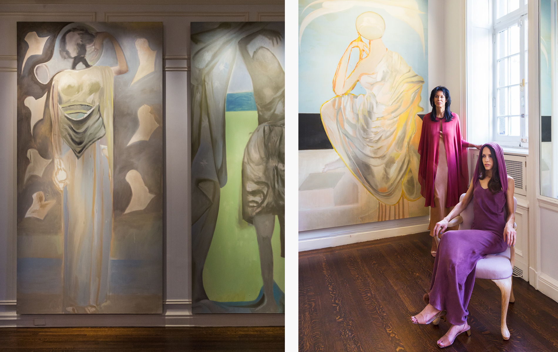 This fall art advisor Kim Heirston opened her regal Upper East Side townhouse to the public to share her little known suite of paintings by Francesco Clemente called Dormiveglia. The words statuesque and classical aptly describe both the feminine goddess figures in this series of Clemente’s work, as well as Kim herself, who’s striking figure exudes grace and a quiet confidence that comes from being at the top of her game.I was fortunate to have a private viewing of these mysterious and symbolic paintings that contain Clemente’s signature self-assured, efficient gestures. The luscious surfaces of the Dormiveglia series line the walls of Kim’s second floor like immersive Rococo wall-panelling. Dormiveglia alludes to dream-like consciousness transporting you to a place that exists between the mythological world of times past and the terra firma of the present moment. Clemente has a way of creating timeless narratives and spaces. On the occasion, I swathed myself and Kim in the timeless and easy elegance of AWAVEAWAKE. A touch Edwardian but with the freedom of a specific bohemia, the designer’s background in sculpture and art history along with her focus on environmental consciousness from concept to completion makes this line a stand out. Post shoot, I sat down to chat with Kim about how she came into possession of this special series of works. We also discussed her idea of good art, collecting and the importance of contemporary and historical knowledge about art.